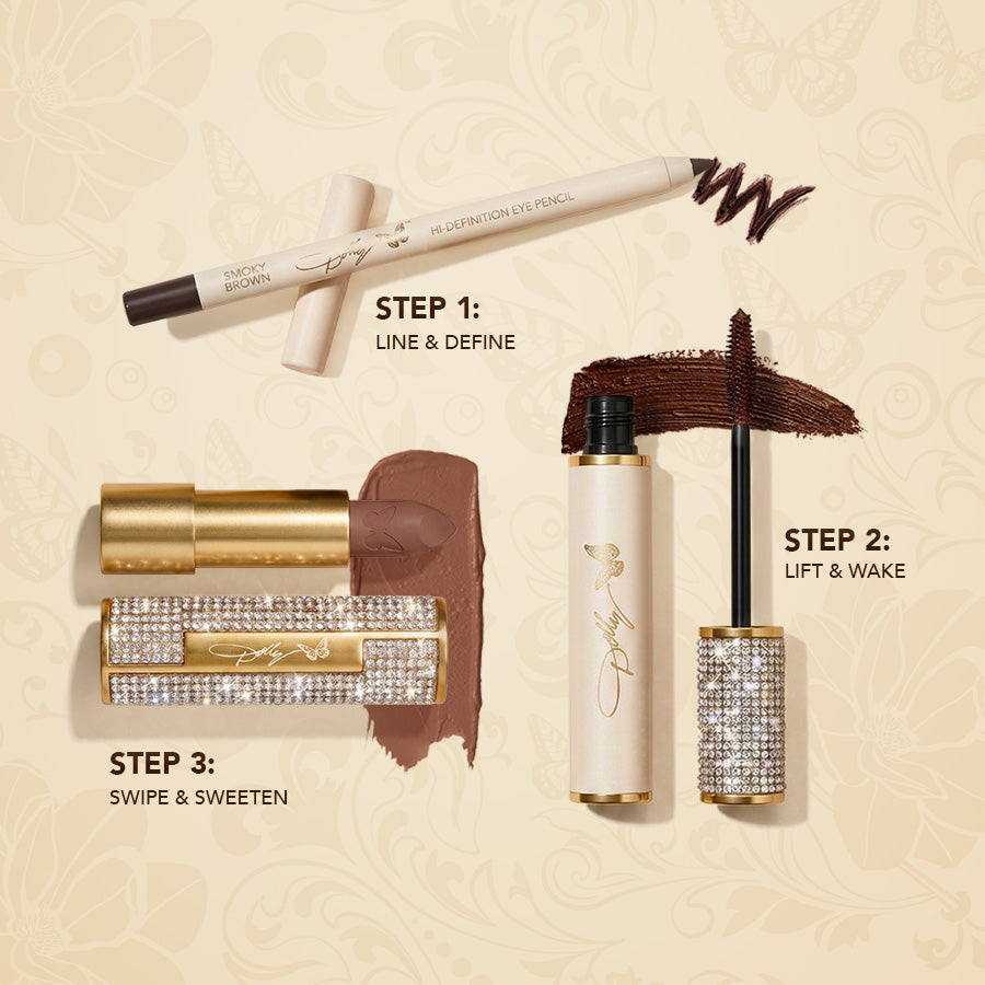 Start your day the Dolly way, a little cream, a little sugar, and plenty of sparkle! This trio brings out your natural radiance, because the sweetest looks are like rhinestones, they shine from within!