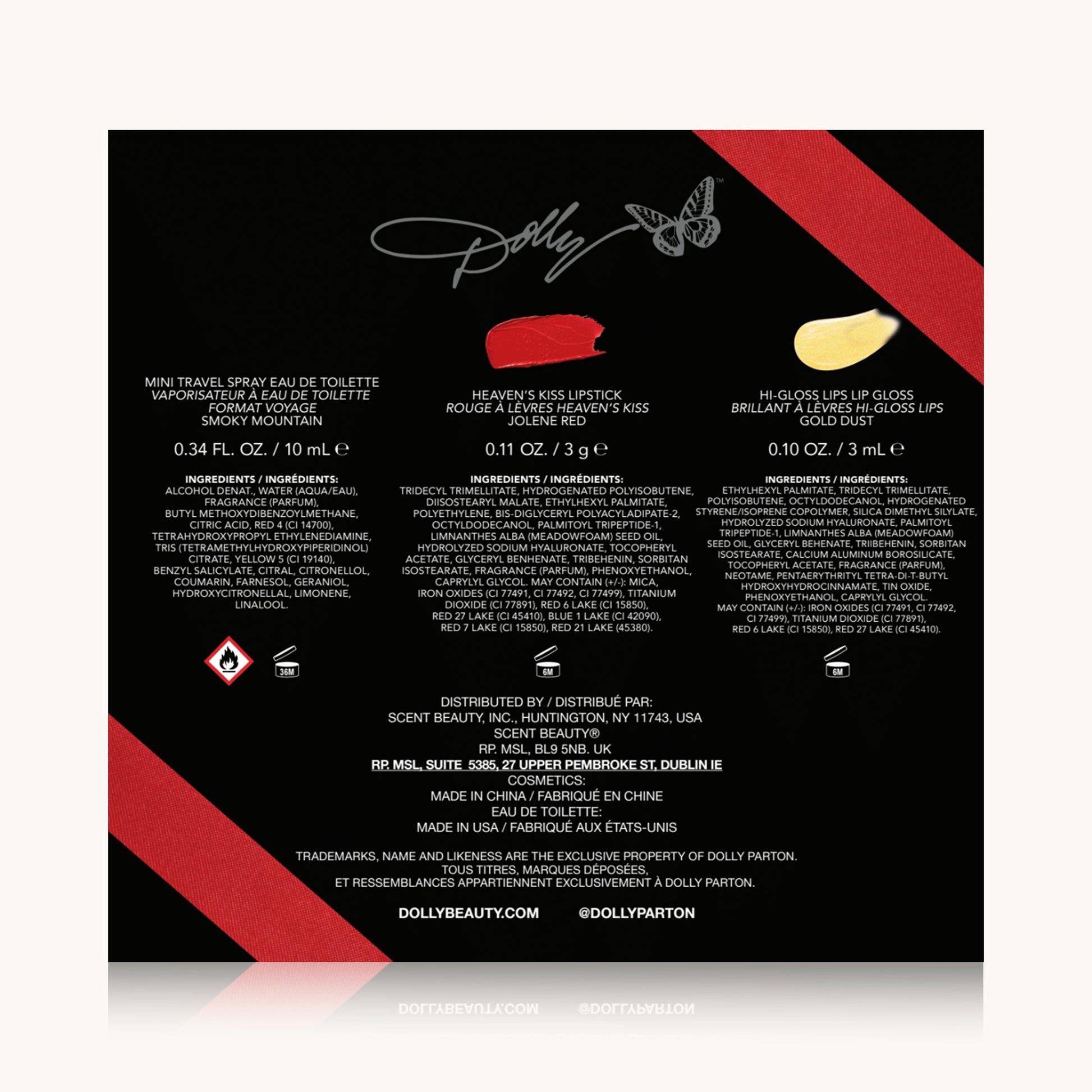 Spray on her Smoky Mountain travel spray, and let the gala begin as notes of wild tiger orchid blend with warm, welcoming cashmere. Amp up the celebration with a kiss of Jolene Red lips immersed in shimmering Gold Dust gloss. It’s a chance to give your inner Jolene the spotlight, and a perfect pairing for all-night revelry – for you, or whoever you think will wear it best.