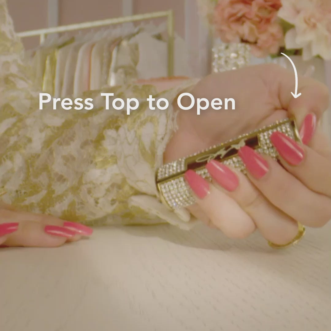 To open the uniquely designed lipstick, click the top of the cap; the lipstick will pop out from the bottom. From there, it’s straightforward: twist the lipstick up to use it, and back down before replacing the cap.
